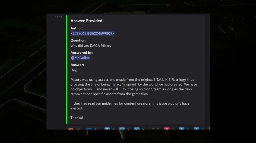 Тогда в сообществе GSC Game World поинтересовались, почему же компания кинула жалобу? Ведь блокировать за простое «вдохновение» как-то странно. Представители GSC Game World ответили, что авторы Misery перешли черту, взяв некоторые ассеты и музыку из оригинальной трилогии S.T.A.L.K.E.R. В компании не против того, чтобы игра продавалась в Steam, но для начала из неё стоит убрать определённый контент.