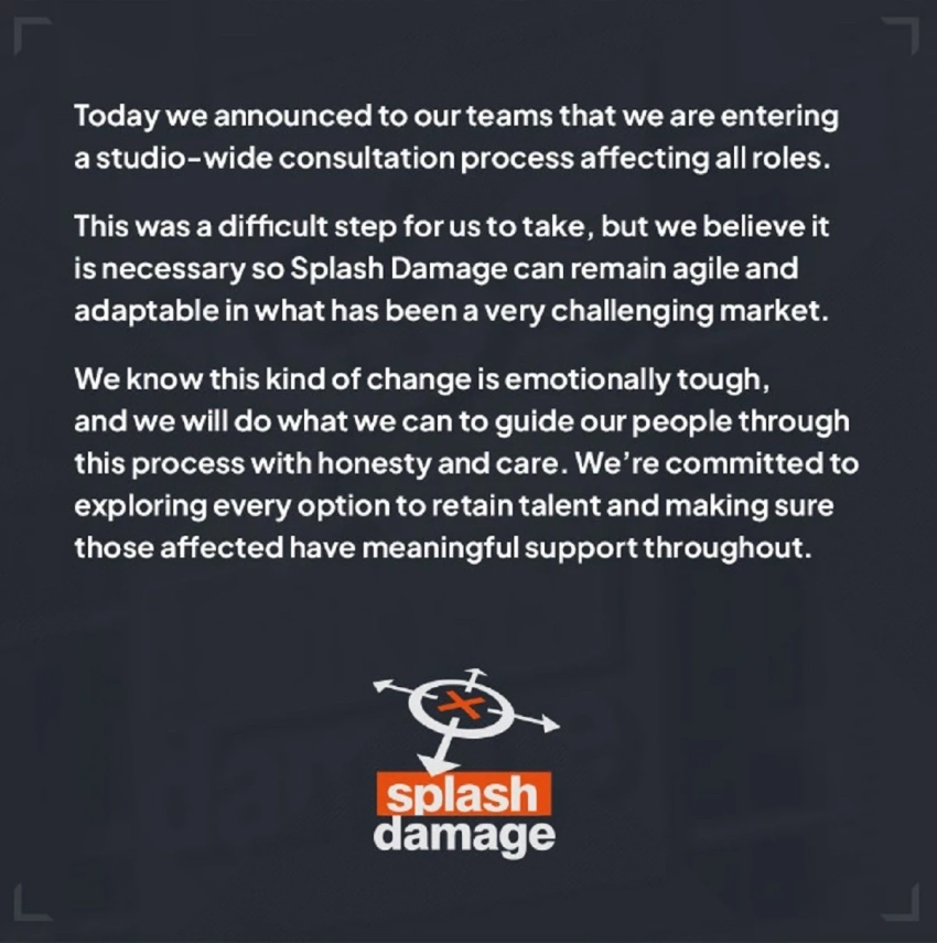 Руководство Splash Damage называет очередную волну сокращений «трудным», но «необходимым» шагом. Всё дело в желании студии оставаться гибкой и адаптируемой для условий на «очень сложном» игровом рынке. При этом руководство сделает всё возможное для удержания талантливых сотрудников и окажет поддержку тем, кто в конечном итоге пострадает от увольнений.