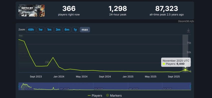 29 ноября в BattleBit Remastered провели первый открытый тест обновления Operation Overhaul. Он длился всего четыре часа и привлёк свыше 6,4 тысячи игроков. В последний раз показатели выше наблюдались лишь весной 2024 года (8,5 тыс. игроков), в декабре 2023 года во время недели бесплатного доступа (почти 40 тыс. игроков) и на релизе. Вскоре после выхода 15 июня 2023 года кубический шутер собрал более 87 тысяч геймеров на пике.