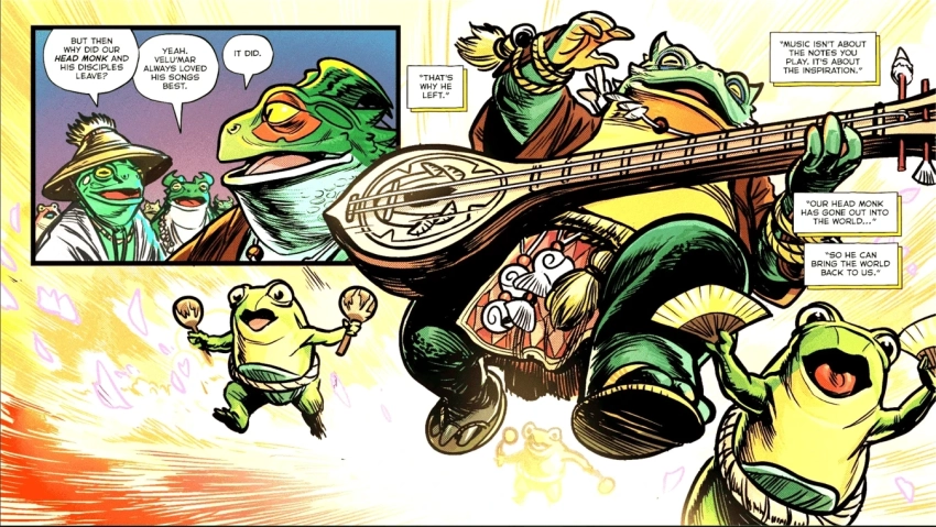 «В отличие от бардов с привычными вам приемчиками (вроде пения о текущих событиях и настройке лютни), Ларго служит духовным главой ордена бардов-монахов. Он подстраивает каждую свою песню под происходящее вокруг, поднимая боевой дух товарищей или, если нужно, темп их шагов по полю битвы (или прочь с него). И раз уж он лягушка, то, скажем так, его цепкий язык способен на многое».