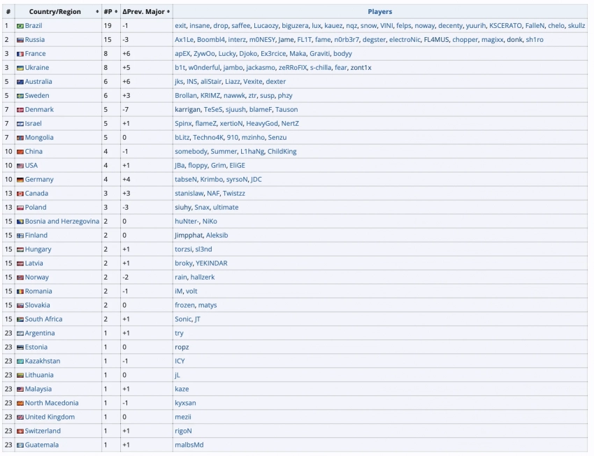 Лидером по количеству участников стала Бразилия, которая отправит на мейджор 19 игроков. На третьем месте оказались Украина и Франция, у каждой страны будет по восемь представителей.
