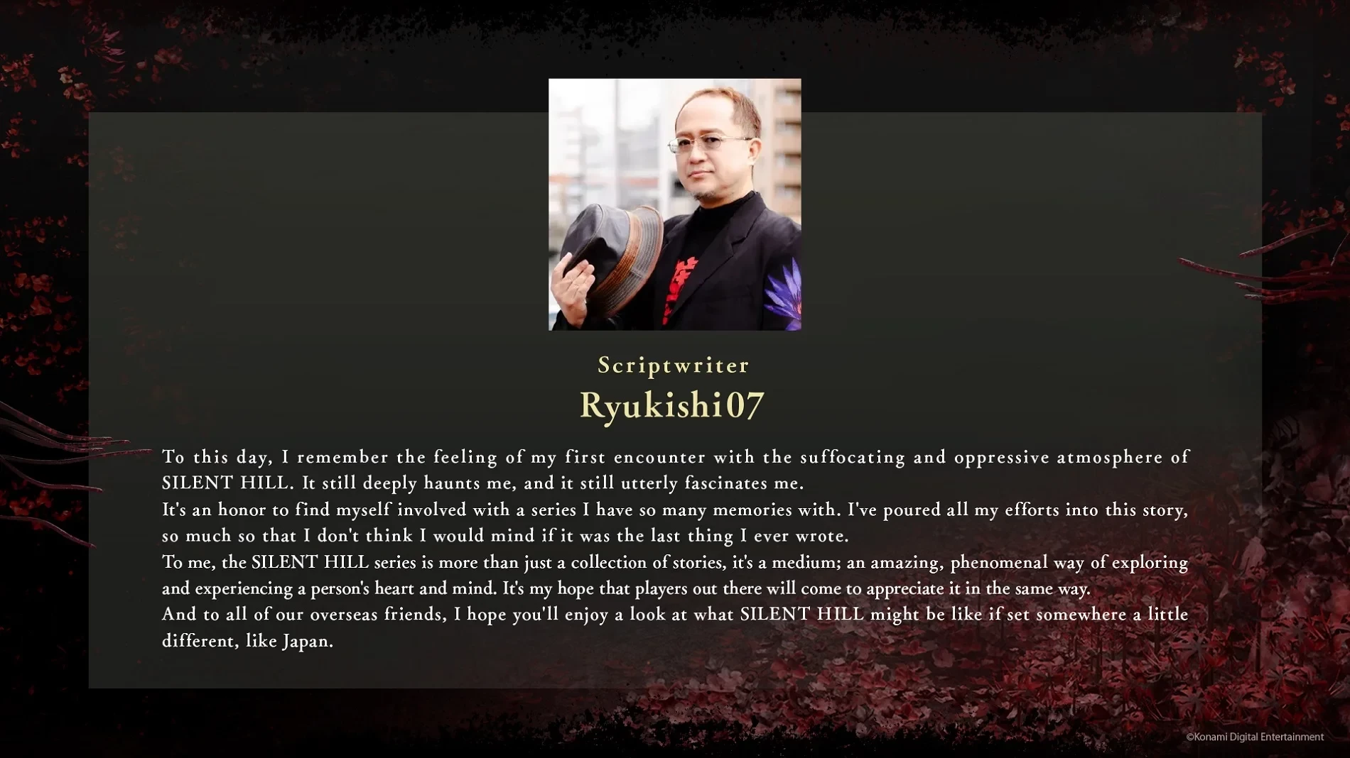 Я до сих пор я помню ощущения от моей первой встречи с удушающей и гнетущей атмосферой Silent Hill. Она всё еще глубоко преследует меня, и она все еще совершенно завораживает меня. Это большая честь — быть вовлечённым в серию, с которой у меня связано так много воспоминаний. Я вложил все свои силы в эту историю, и думаю, что был бы совсем не против, если бы она оказалась последним, что я написал, — Ryukishi07.