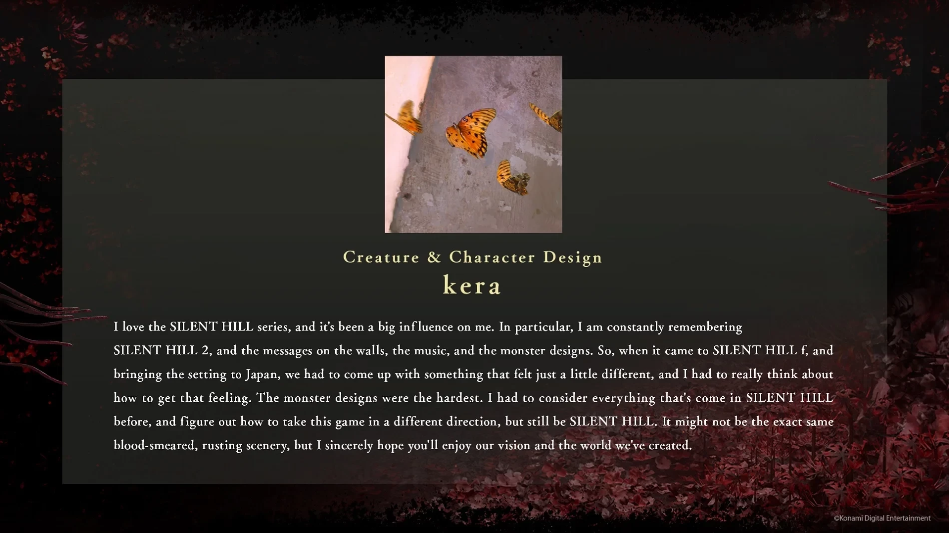 Дизайн монстров оказался самым сложным. Мне пришлось учесть всё, что появлялось в прошлых играх серии, и пойти в другом направлении, сохраняя саму суть Silent Hill. Новинка обошлась без повторения того самого окровавленного и заржавевшего окружения, но я надеюсь, что вам понравится наше видение и созданный нами мир, — Kera.