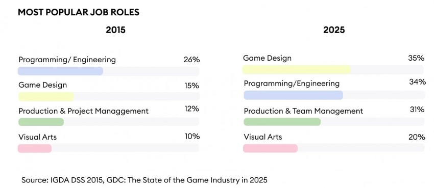 • Меняется не только средний возраст. В 2015 году женщины составляли лишь 19% от общего числа разработчиков игр, но в 2025 году этот показатель подскочил на 6%.
