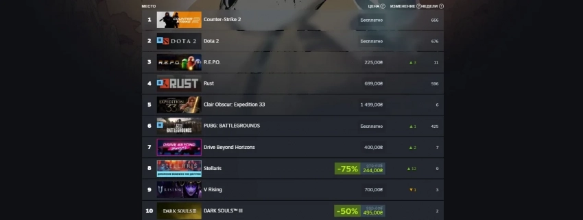При этом чарт российского сегмента Steam несколько отличается от мирового. Да, наверху всё так же стоит Counter-Strike 2, но следом идут Dota 2, R.E.P.O. и Rust. «Экспедиция 33» при этом находится только на 5 строчке.