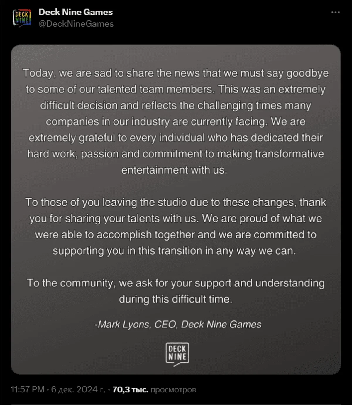 «Сегодня мы с грустью сообщаем, что нам придется попрощаться с некоторыми из наших талантливых сотрудников. Это было чрезвычайно трудное решение, которое отражает сложные времена, с которыми сталкиваются многие компании в нашей отрасли. Мы бесконечно благодарны каждому, кто посвятил свою трудолюбие, страсть и преданность делу создания трансформирующего контента вместе с нами».