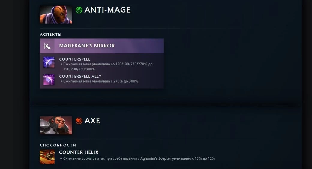 - Anti-Mage: аспекты Magebaneʼs Mirror, Counterspell — сжигаемая мана увеличена со 150/190/230/270% до 150/200/250/300%; Counterspell Ally — cжигаемая мана увеличена с 270% до 300%;