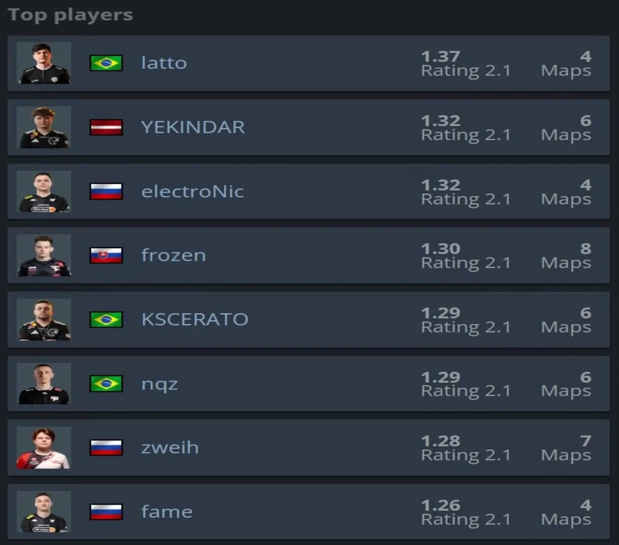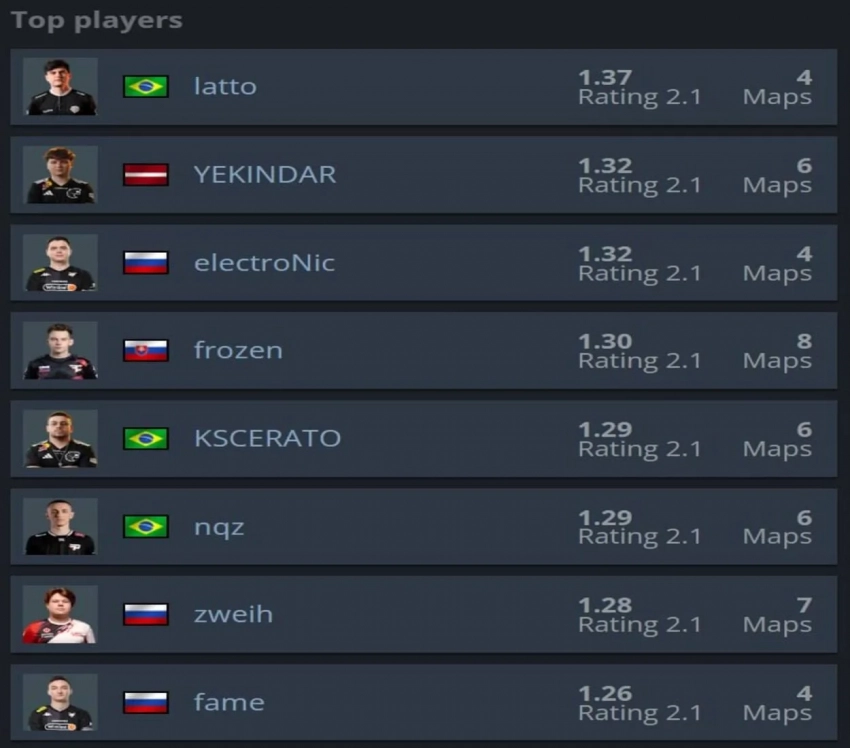 Первое место в этом рейтинге занял Бруно «latto» Ребелатто из команды Legacy. Бразильский игрок показал выдающуюся игру на четырёх картах, со средним рейтингом 1,37.