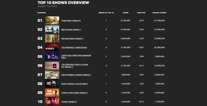 Тем временем первое место в топе англоязычных сериалов Netflix занял шестой сезон «Виргин Ривер» — у него 8,1 млн просмотров.
