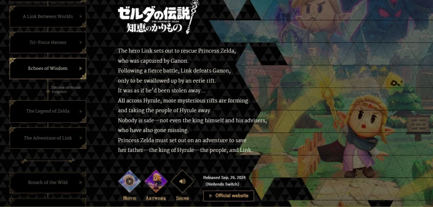 Согласно официальной хронологии, события Echoes of Wisdom разворачиваются после Tri-Force Heroes. Следом идёт оригинальная The Legend of Zelda, причём эти две игры разделяет упоминание, что королевство Хайрул находится в упадке — что не повышает доверие к самостоятельной деятельности Зельды.