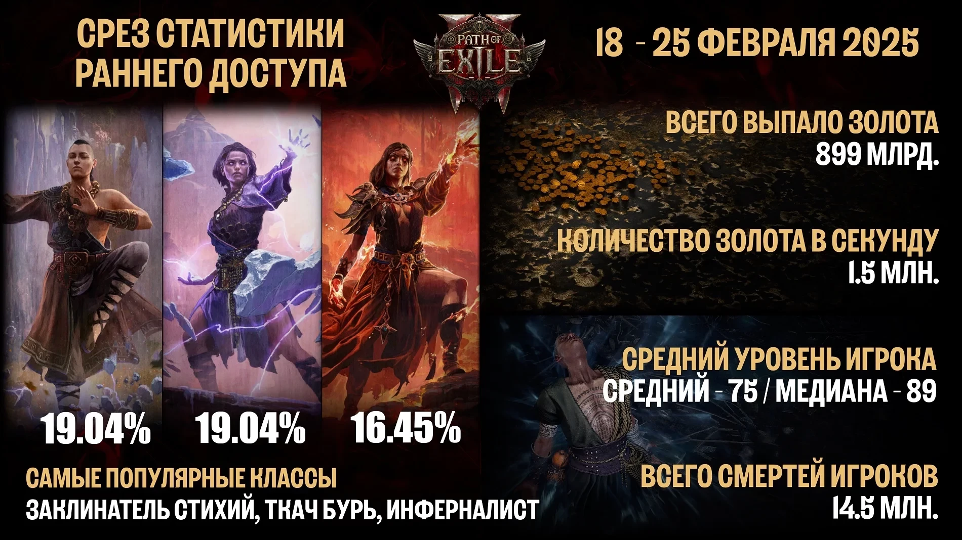 Ещё больше интересных видео на YouTube канале Игромании!Обложка: игра Path of Exile 2Grinding Gear Games представила срез статистики раннего доступа Path of Exile 2. Ниже можно ознакомиться с недельным отрезком данных за период с 18 по 25 февраля 2025 года: