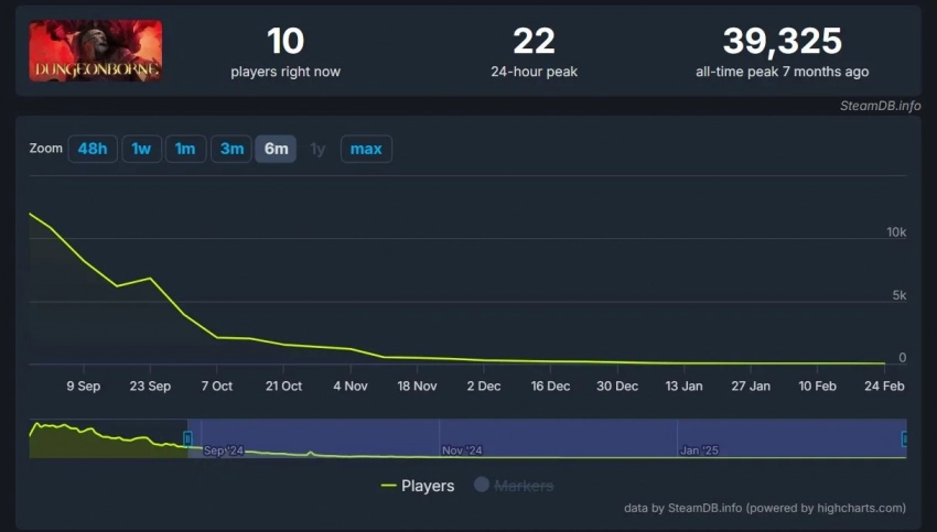 Ещё больше интересных видео на YouTube канале Игромании!Скриншот DungeonborneСтудия Mithril Interactive в июле 2024 года выпустила в ранний доступ мрачное фэнтези Dungeonborne. Игра с самого начала пользовалась интересом игроков, хотя её и называли клоном известной Dark and Darker. Однако этот интерес довольно быстро начал угасать: в то время как на пике её онлайн составил без малого 40 тысяч, сейчас в игре, по данным SteamDB, находится 7 человек.