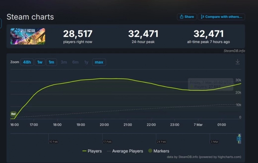 Поэтому заглянем в Steam. Здесь пиковый онлайн новинки достиг 32 471 игрока одновременно. Это ставит Split Fiction между It Takes Two (71 039 игроков) и A Way Out (8 582 игрока).