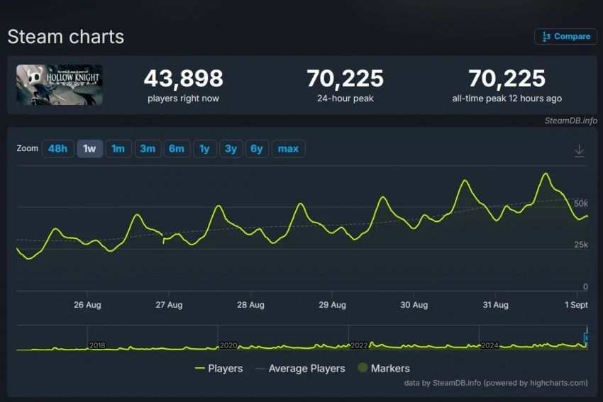 Тем временем первая Hollow Knight вновь обновила личный рекорд пикового онлайна в Steam. Только на прошлой неделе мы сообщали о 50 тыс игроков одновременно, а теперь показатель достиг 70 225 игроков одновременно.