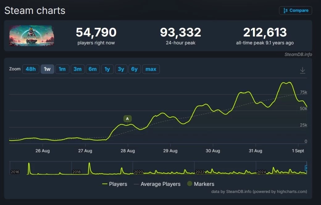 Согласно SteamDB, суточный пик онлайна No Manʼs Sky оказался выше, чему у Marvel Rivals (88 679), Tom Clancyʼs Rainbow Six Siege X (83 777), Dead by Daylight (78,517) и так далее.